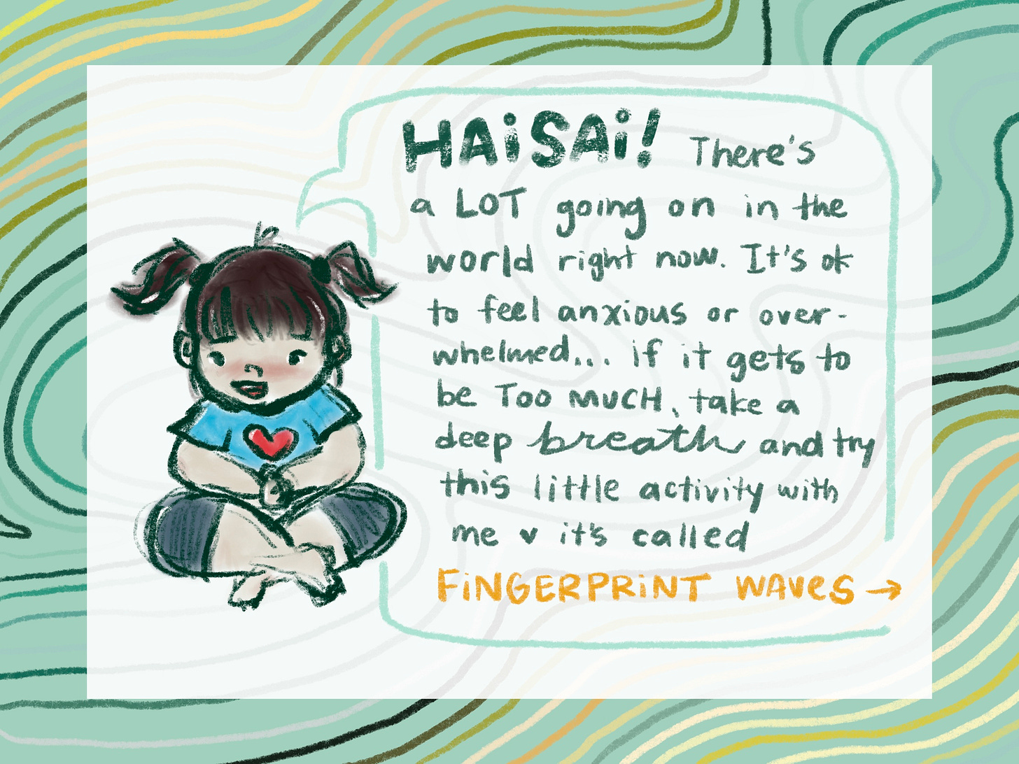 be sure to check in with your breath throughout the whole process. there’s no need to control your breath, just let it move however it needs to in that moment, but try your best to notice if you’re holding it in. if that’s the case, see what happens if you let it go, see how it moves when you refrain from holding it back. hopefully, by the end of your practice you have a little more of an even, steady breath, that may have helped you to find that sense of calm. if not, no worries! your body might just need more time to process. allow yourself to sit with the discomfort, but again, if it is too much then try the fingerprint waves practice once again. take your time!